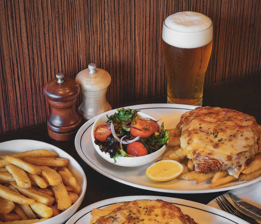Golden, crispy chicken schnitzel topped with rich napolitana sauce and melted cheese — a classic Chicken Parma done right. Served hot, hearty, and full of flavour, with a free soft drink included.